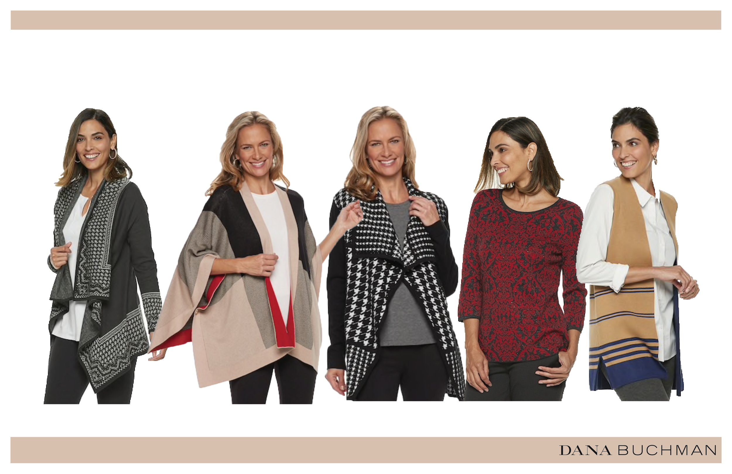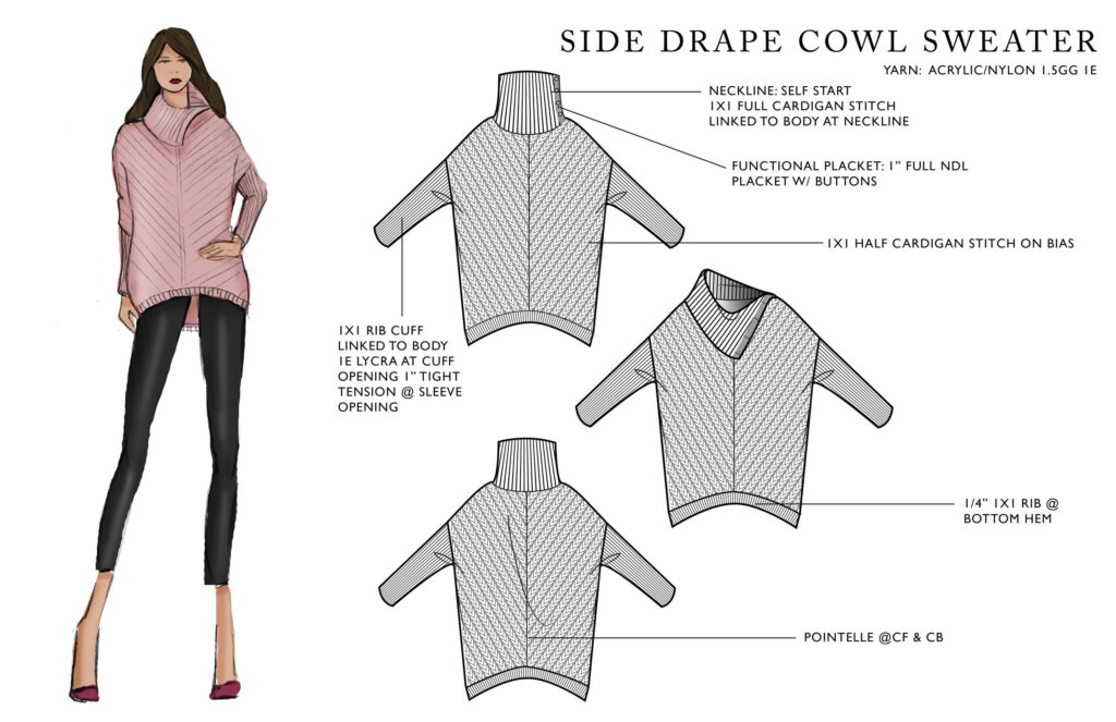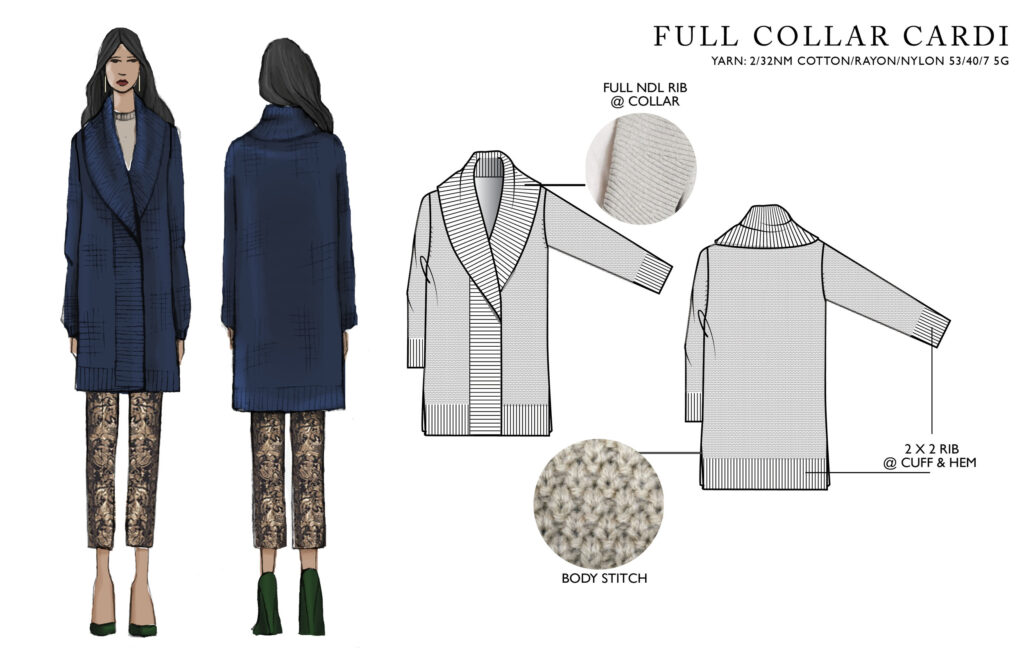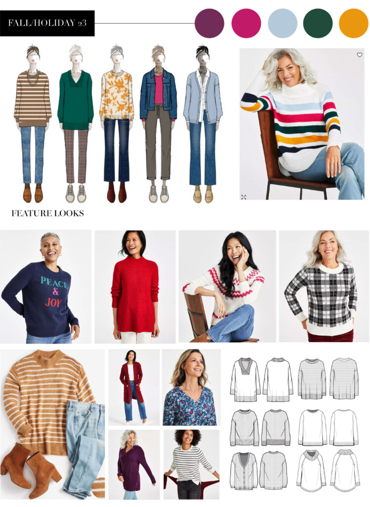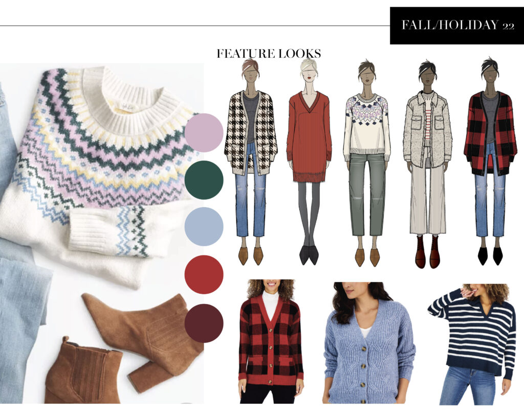 I spent two years designing for the Dana Buchman brand at Kohl’s, contributing across multiple product categories. My most challenging and rewarding project was the Fall ’18 sweater collection, shown below. Customers responded strongly to the textured stitching and jacquard patterns, which required advanced technical execution.