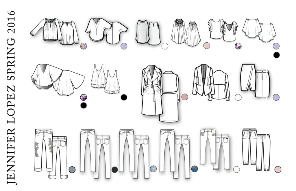 Working on the Jennifer Lopez brand was an exciting journey into the world of glitz and glam, where luxury and boss behavior defined every design. From start to finish, I helped research, develop, and design collections that embodied Jennifer’s iconic style, incorporating luxurious yarns, gold chains, lurex, and hairy textures even into sweaters. Collaborating closely with Jennifer Lopez and her stylists, we brought each garment to life, constantly evolving our designs based on customer feedback, Jennifer’s needs, and market trends. This process involved numerous iterations, from fabric selection to embroidery thread color, ensuring every detail was perfect. Collections included trend-right inspirations sourced from markets in LA and NYC, and even featured pieces that Jennifer herself wore.